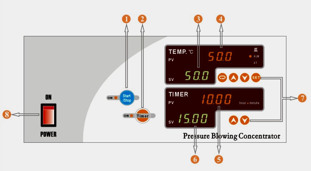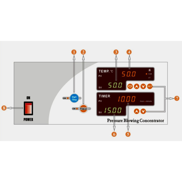 本儀器藉由管路及吹針將氮氣吹到樣品表面,完成液體樣品的無氧濃縮。