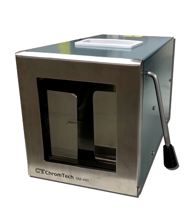 - 經由儀器背部的旋鈕可以方便調節拍擊板與安全門之間的距離,以適用於不同的破碎要求。