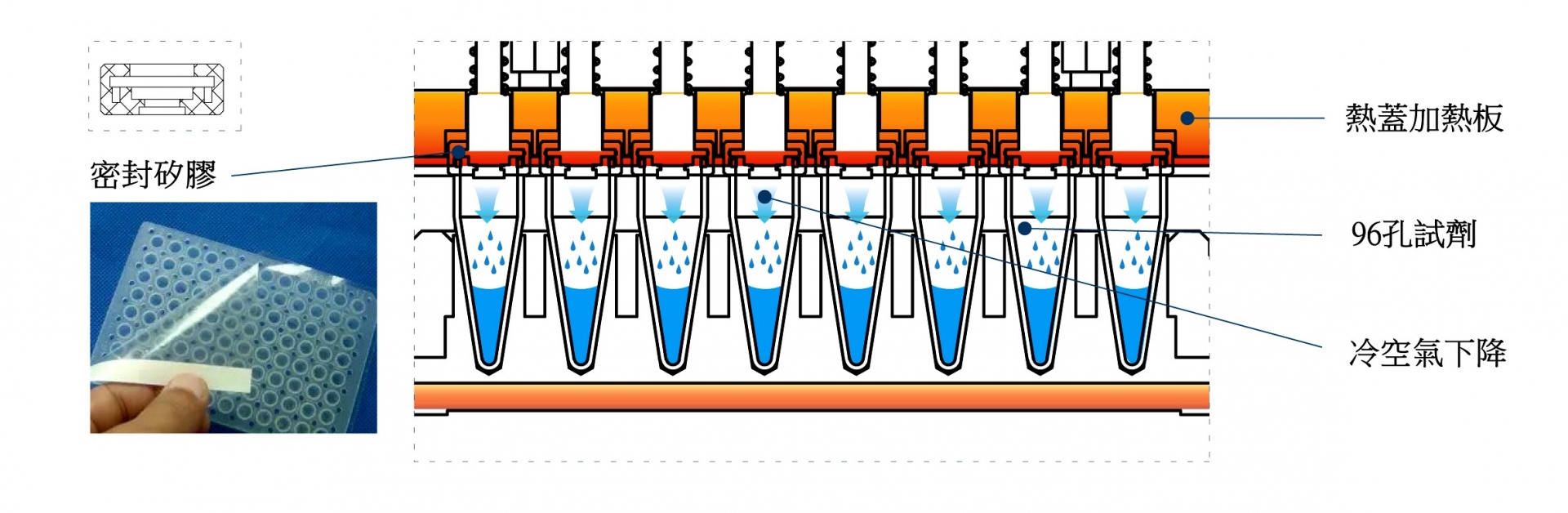 1.熱蓋採用密封性極佳的矽膠材料,加上熱蓋垂直下壓設計,每個孔內的樣品試劑在實驗中零蒸發。